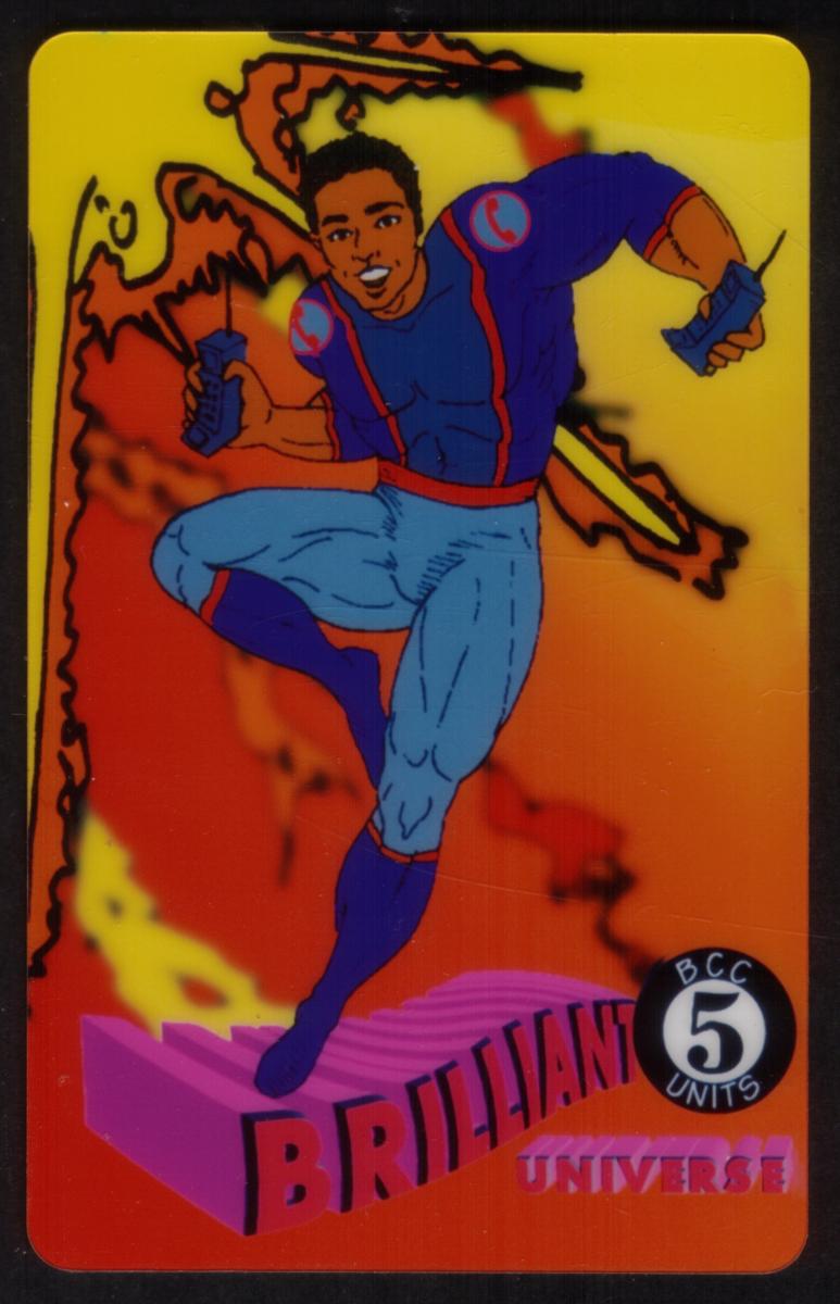This collectible phone card features a vibrant, stylized illustration of a superhero figure in mid-action, set against a bold orange and yellow gradient background with abstract flame-like designs in the back. The character is a young man with short black hair, wearing a blue costume with purple and red accents, including a large red "C" emblem on each shoulder. He is holding two telephones, one in each hand, one of which has a visible keypad.