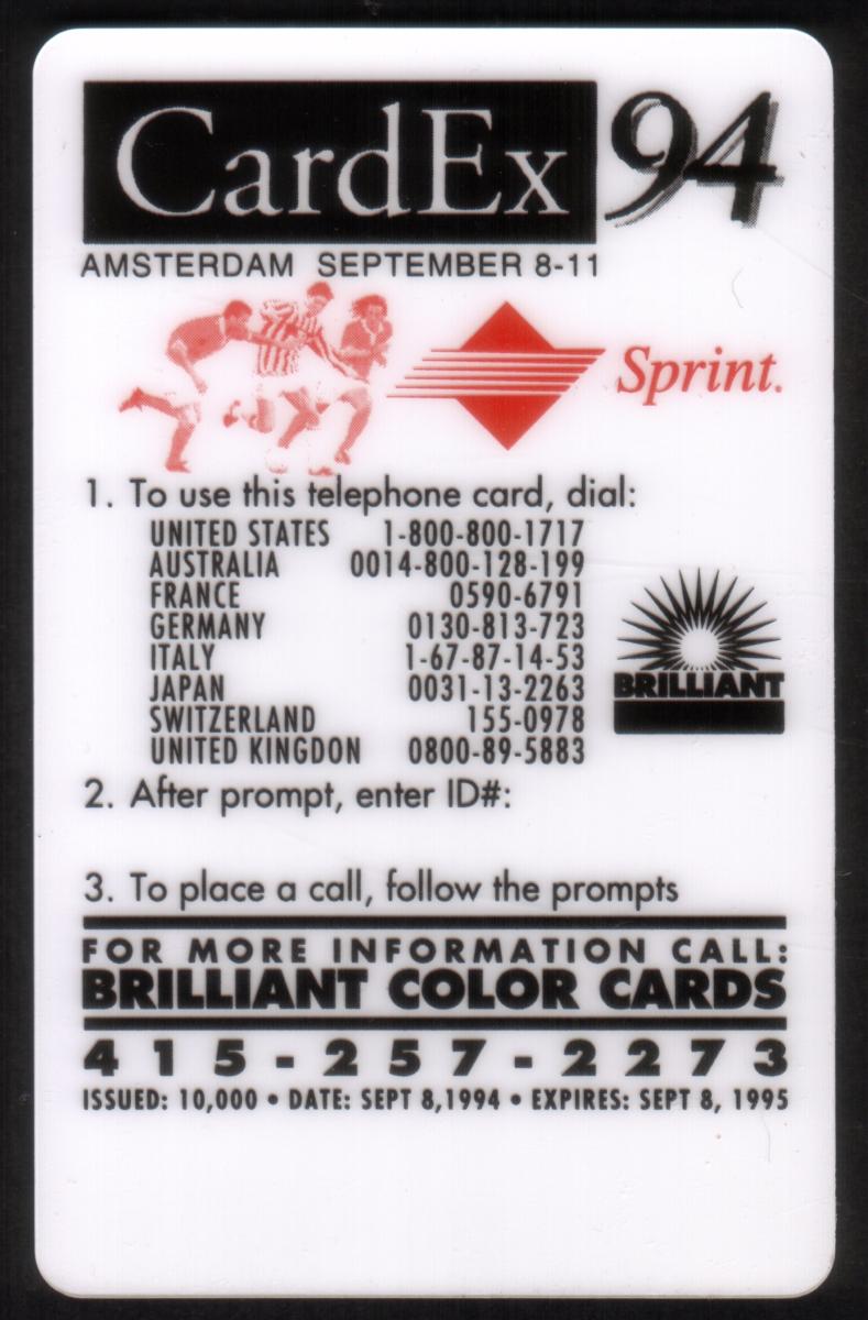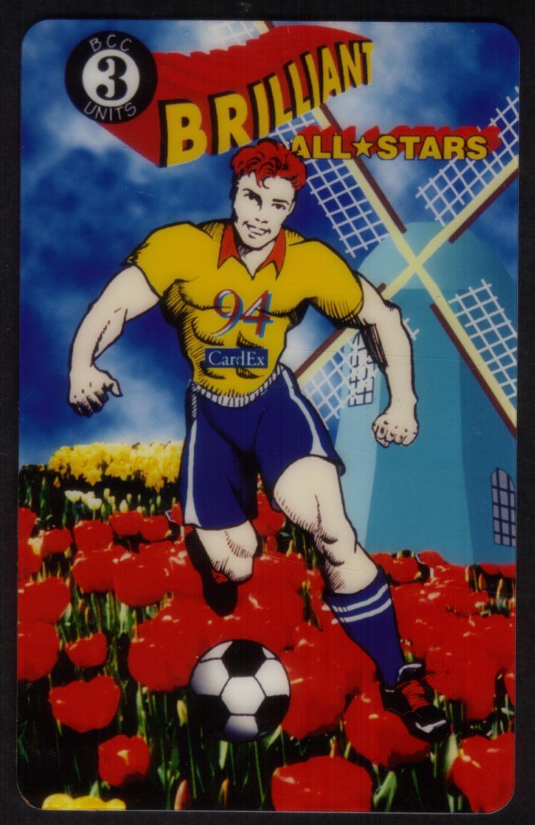 This card is associated with the "CardEx 1994" series, indicated by the details on the jersey and the references in the image. It clearly ties into the sport of soccer (futbol, fotboll), and is part of the "Brilliant Color Cards" set related to CardEx Amsterdam Sprint. The design combines artistic cartoon elements with a theme highlighting soccer and Dutch cultural symbols.