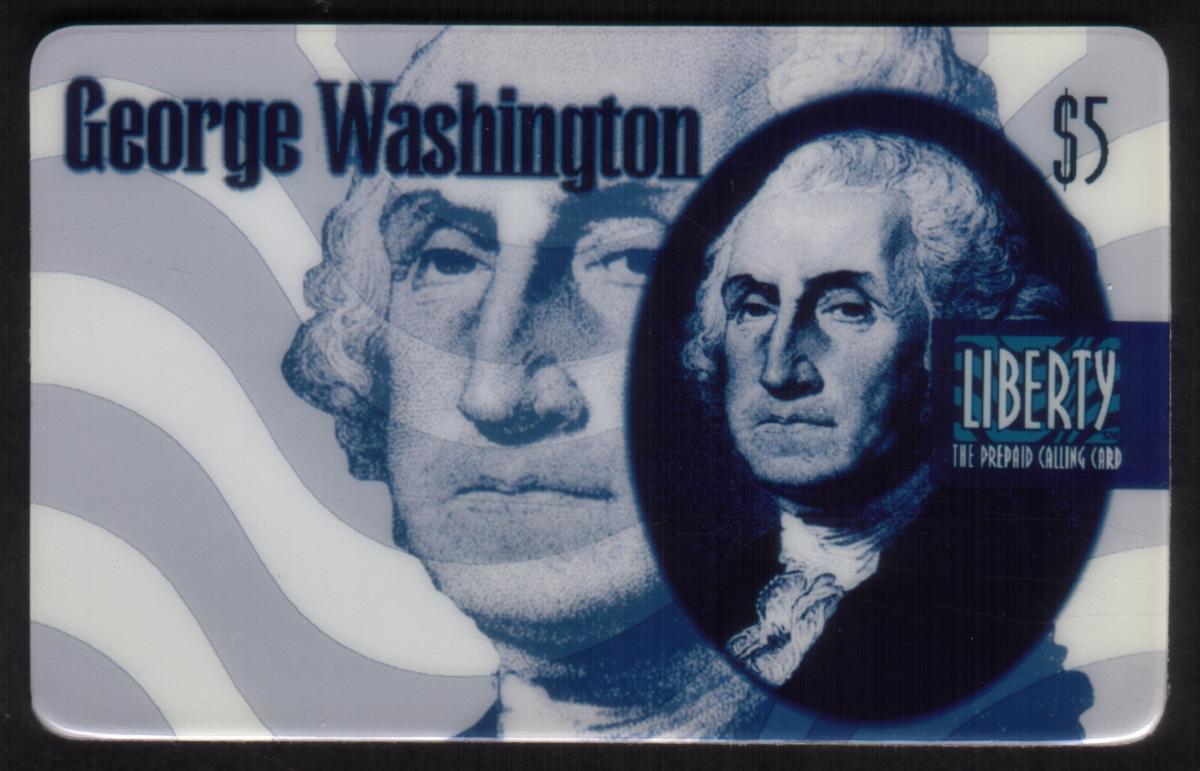 The card has a dominant blue and white color scheme, with a stylized, wavy flag pattern that runs horizontally across the card, reinforcing the patriotic theme. In the upper left corner, the text "George Washington" appears in bold, dark blue font. In the upper right corner is the denomination "$5," indicating the card’s prepaid value.