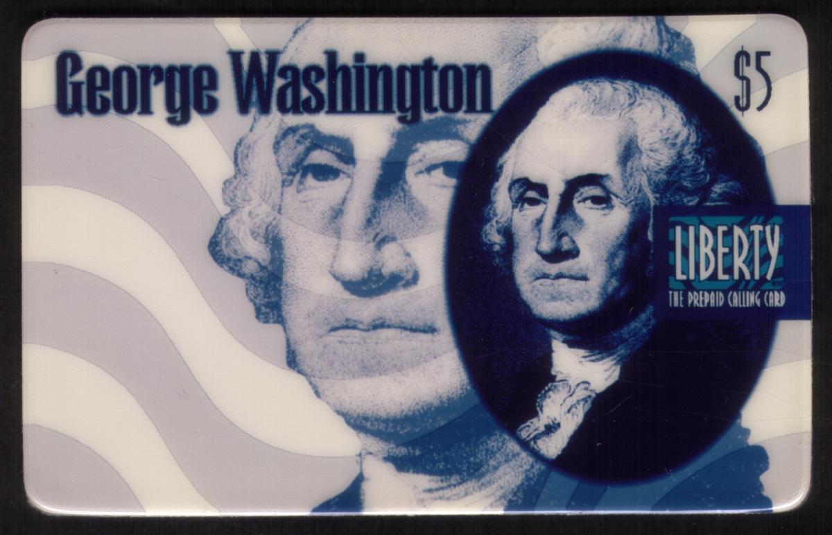 In the upper right corner, the denomination "$5" is shown, indicating the card’s value. Next to the portrait on the right side, there is an emblem containing the word "LIBERTY" with the subtitle "THE PREPAID CALLING CARD," denoting its use as a prepaid calling card. The design is clear and focused on American history and political heritage, emphasizing Washington as a famous American president and a symbol of Americana.