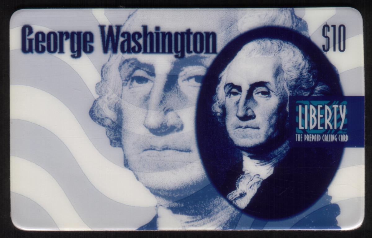 This collectible prepaid calling card reflects themes of American politics, history, and notable portraits, specifically dedicated to George Washington. The design emphasizes his legacy with clear text, formal imagery, and the inclusion of the prepaid calling card brand, "LIBERTY."