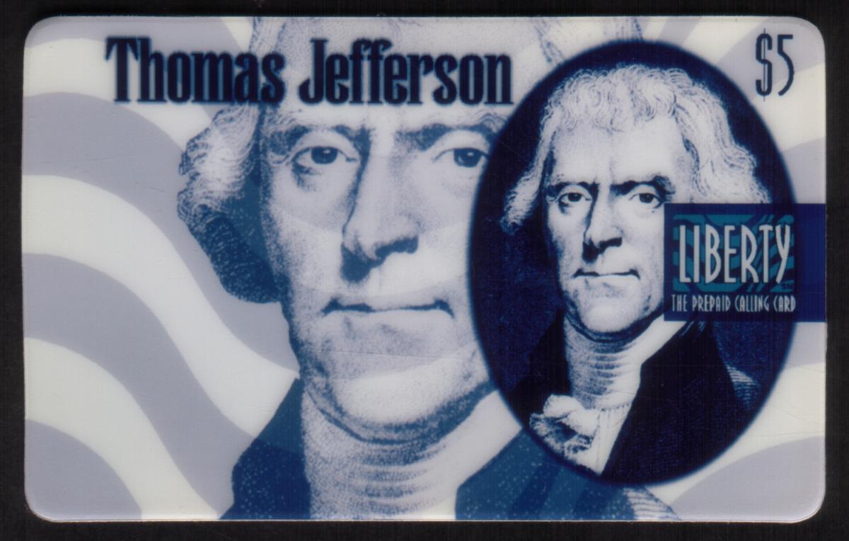 On the right side of the card, there is a smaller, oval vignette showing another detailed black-and-white image of Thomas Jefferson, adding visual emphasis to his historical significance. Adjacent to this smaller portrait is the “LIBERTY” logo in blue and white, accompanied by the text "THE PREPAID CALLING CARD."