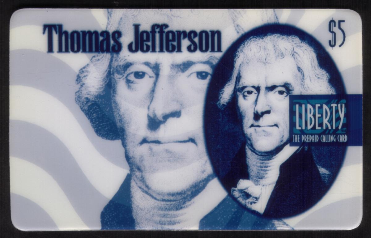 Thomas Jefferson prepaid phone card with patriotic design, featuring dual portraits, liberty theme, $5 value, and historical imagery for American history enthusiasts. |