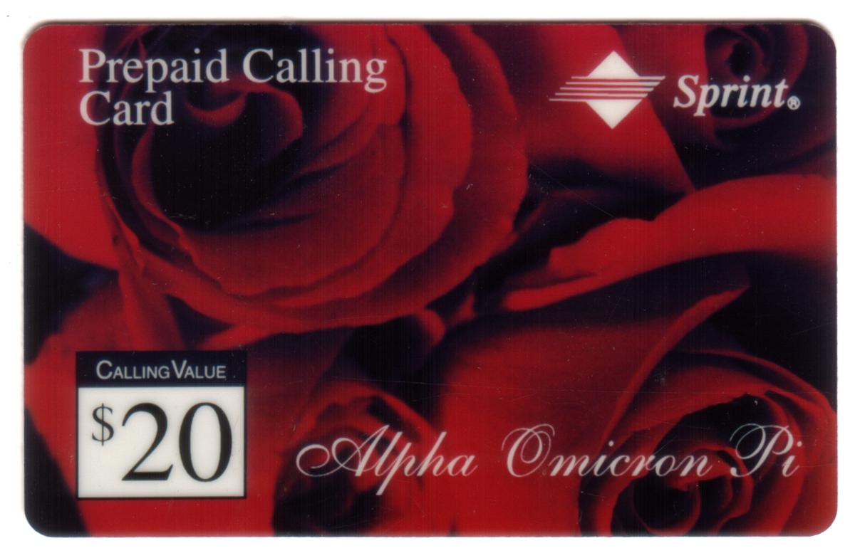 This collectible prepaid calling card from Sprint features a close-up image of red roses as its background, creating a rich and elegant visual effect. The card prominently displays its calling value of $20 in a white box with black text located in the bottom left corner. The name "Alpha Omicron Pi" is elegantly scripted in white cursive text across the lower middle section of the card, representing the women's fraternity.