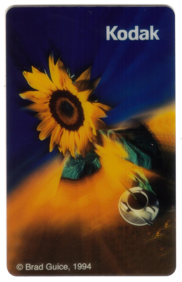 The word "Kodak" appears in a bold, white font near the top right corner of the card. At the bottom left corner, the card includes the copyright credit "© Brad Guice, 1994," indicating the photographer and year of the image's creation. The overall color palette of the card emphasizes brilliant yellows and blues, creating a striking contrast that highlights the natural beauty of the sunflower.