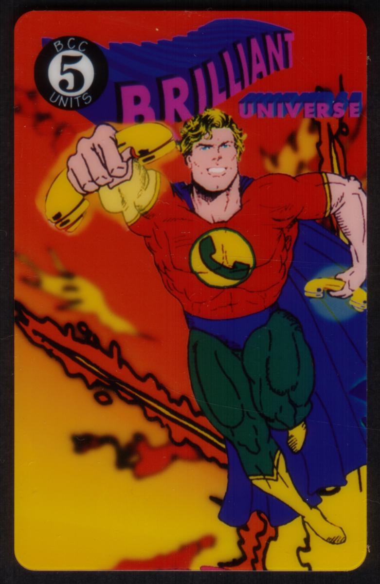 This is a collectible phone card from the Brilliant Universe series, featuring a superhero character in dynamic action. The character is depicted as a muscular man with blond hair, wearing a red shirt emblazoned with a green circular emblem that contains a black design resembling a stylized bird or letter "L." He also wears green pants, yellow gloves, and yellow boots, complemented by a flowing blue cape. The card’s background consists of fiery orange and red flames, enhancing the sense of motion and intensity.