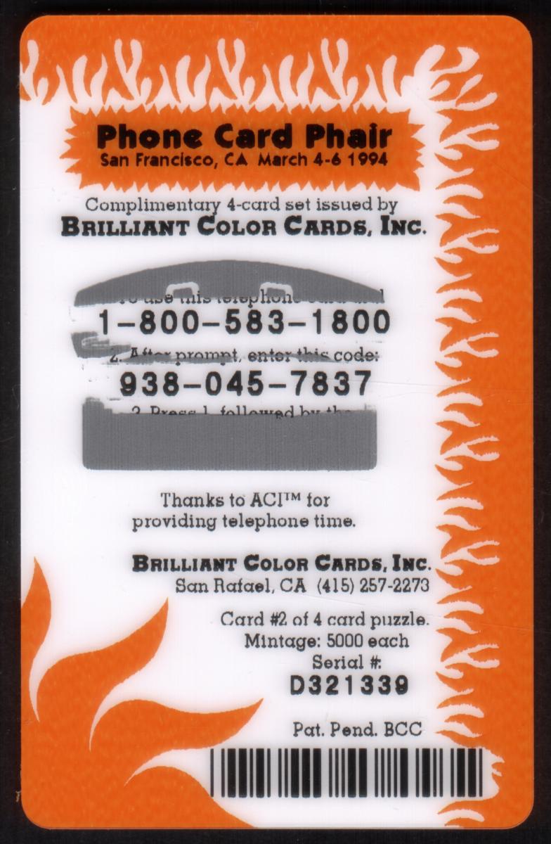 This card is used, as stated in the keywords associated with the Brilliant Universe Tele-Card Man series, and originates from the Phone Card Phair event held in March 1994 in San Francisco, California. It belongs to the category of Telecard Events collectible phone cards and is distributed by Brilliant Color Cards.