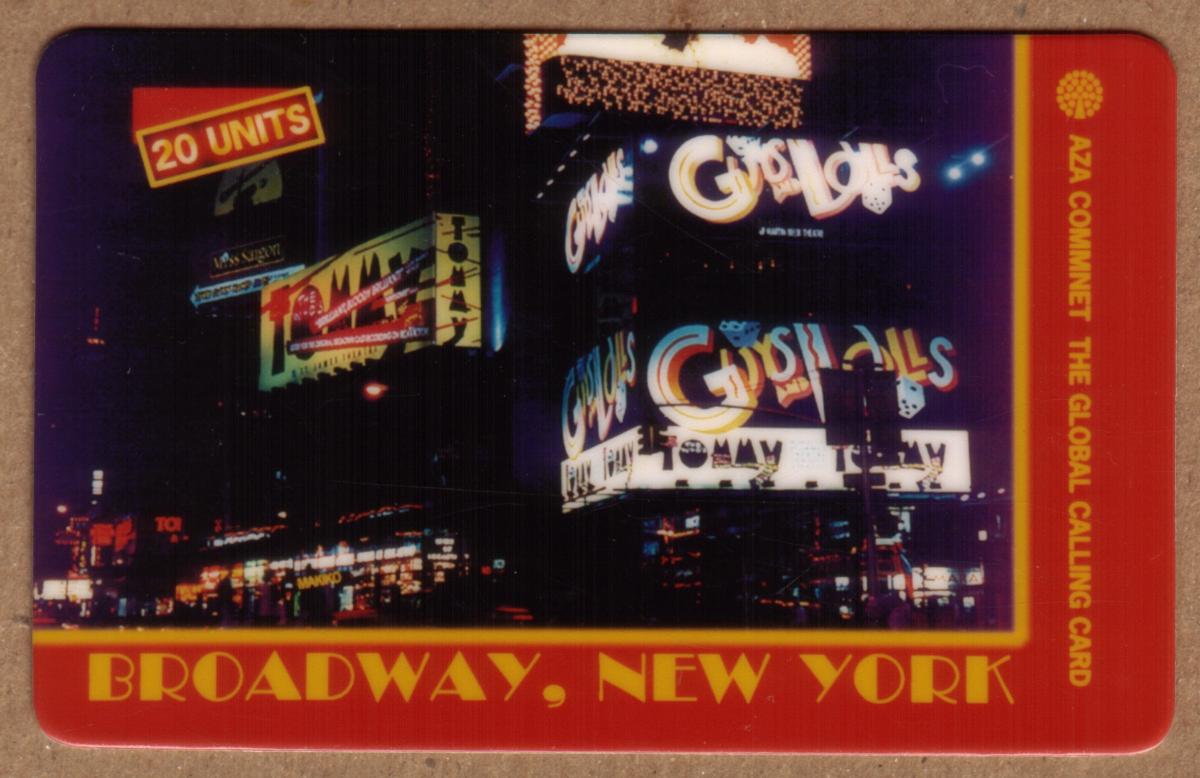 Text elements on the card include "BROADWAY, NEW YORK" in bold yellow capital letters along the bottom border against a red background. The right vertical edge also includes the phrase "AZA COMMNET THE GLOBAL CALLING CARD" in yellow print, accompanied by a circular sun-like logo at the top. A small yellow rectangle at the upper left corner denotes the card’s value as "20 UNITS."