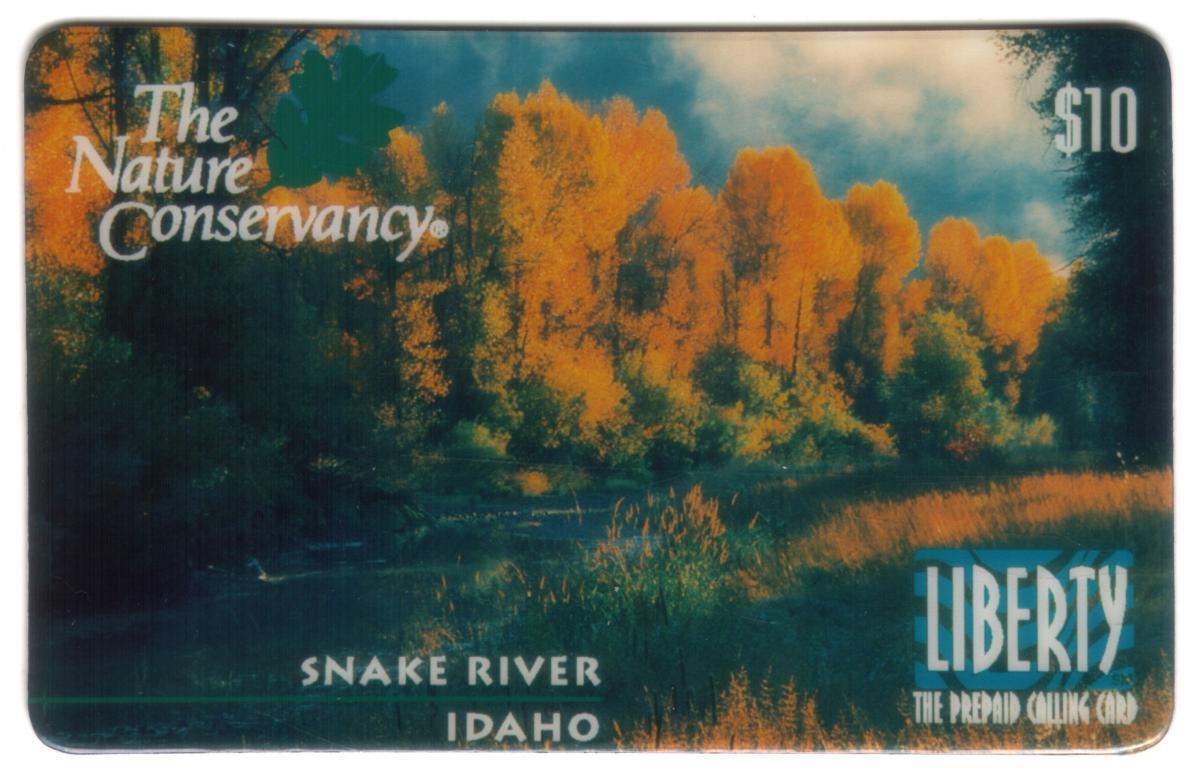 On the lower right side, the word "LIBERTY" appears in bold letters, accompanied by the phrase "THE PREPAID CALLING CARD," identifying the card’s function as a prepaid phone card. This card reflects themes of nature conservations, wildlife reserves, and natural habitats, aligned with The Nature Conservancy’s mission to protect and preserve vital environmental areas like the Snake River region.