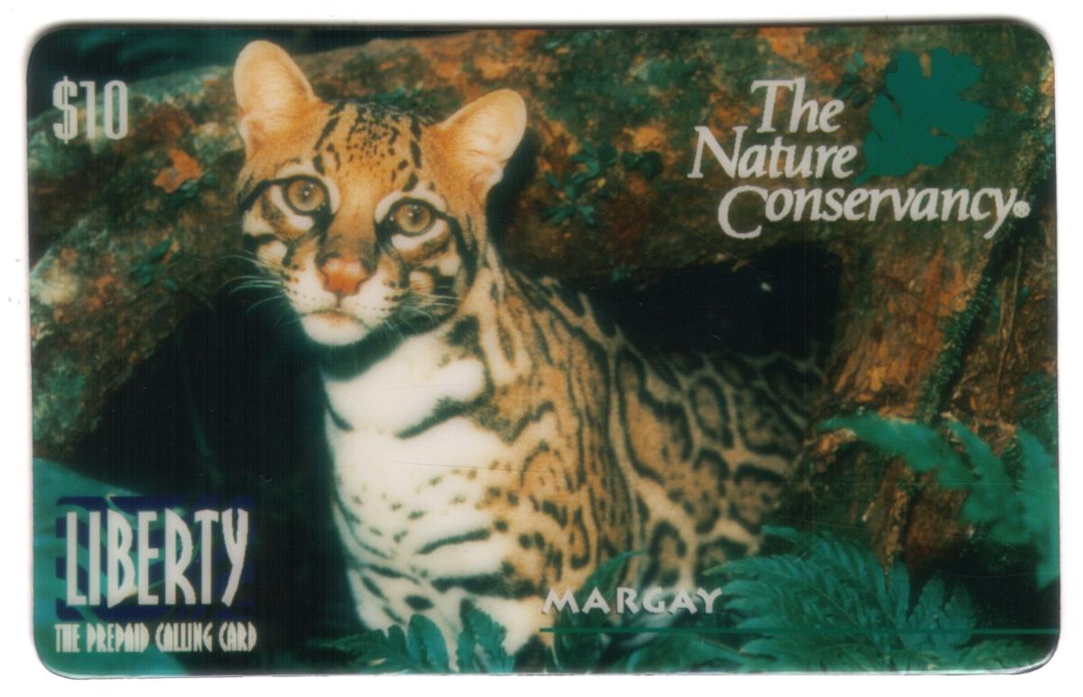 This phone card combines wildlife imagery with branding from The Nature Conservancy and Liberty, making it a collectible item that supports themes of wildlife preservation, natural habitats, and environmental activism. The clear photographic design and text emphasize the margay cat as a symbol of wild animals and nature conservation efforts.