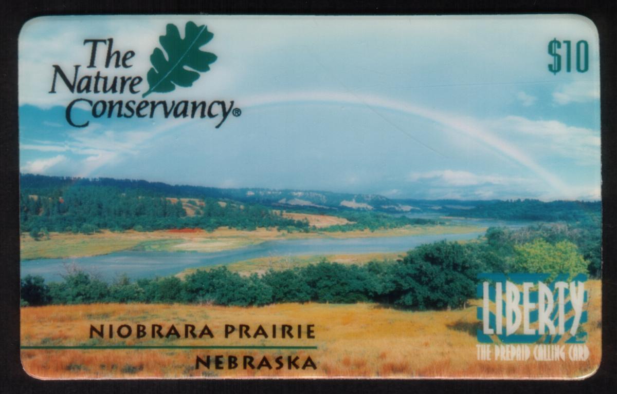 At the bottom right, the word "LIBERTY" appears in bold white letters with the subtitle "THE PREPAID PHONE CARD" beneath it, indicating the card's use. Near the bottom left, "NIOBRARA PRAIRIE NEBRASKA" is written in black capital letters on the image itself, identifying the featured natural location. The card aligns with themes of wildlife reserves, nature conservations, environmental activism, and natural habitats, specifically capturing the Niobrara Prairie region protected by The Nature Conservancy.