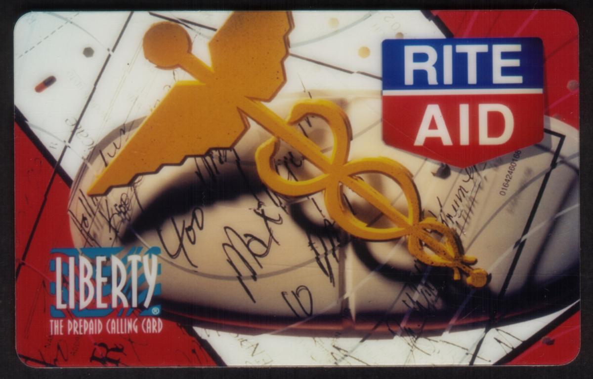 This collectible phone card is a Rite Aid promotional item featuring a medical emblem design. The card prominently displays the Rite Aid logo in the upper right corner, consisting of white text on a blue and red rectangular background. The main imagery on the card includes a large golden caduceus, a traditional medical symbol with two snakes winding around a winged staff. The caduceus is positioned at an angle across a background of handwritten medical notes or prescriptions, rendered in black cursive script on white paper, adding a professional and authentic medical theme to the design.