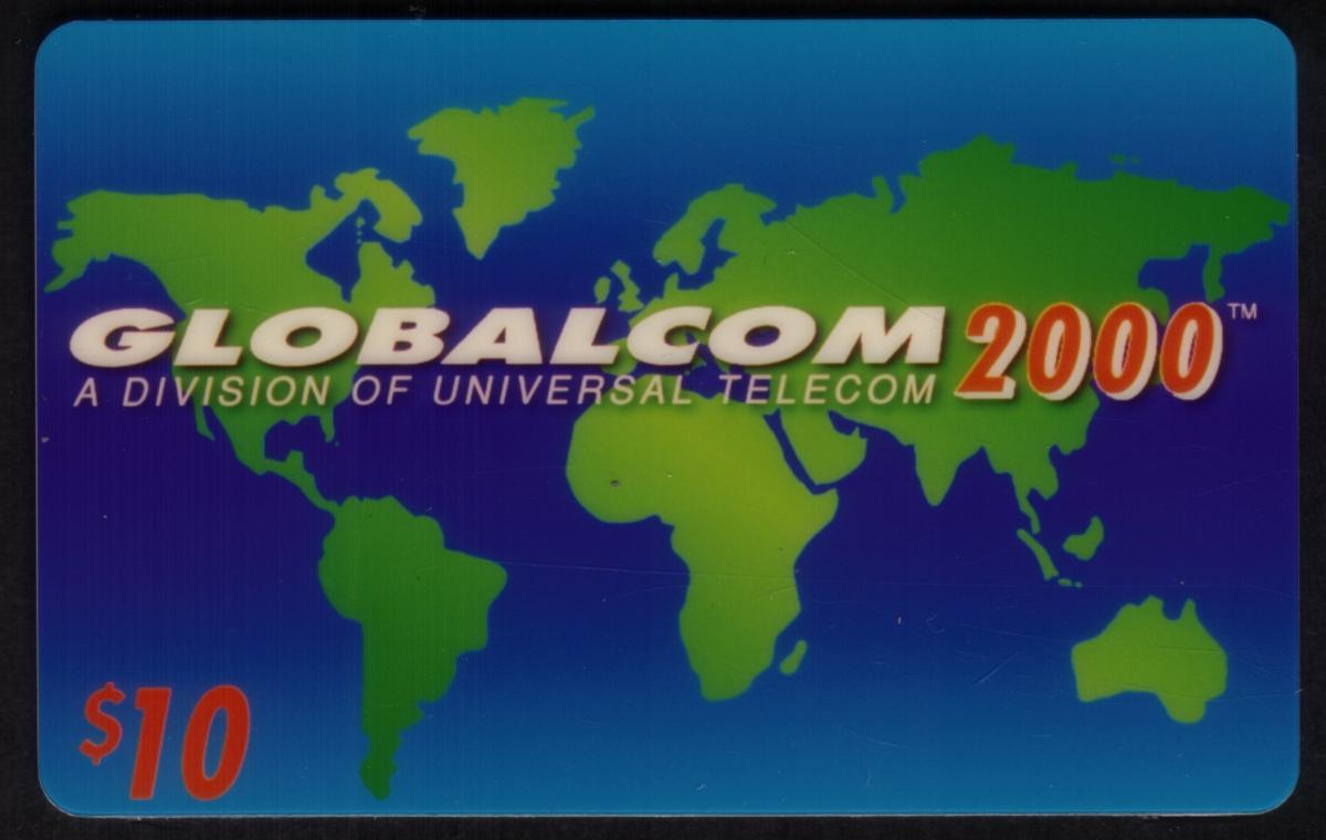 This collectible phone card features a green world map on a blue gradient background. The continents are prominently displayed in a bright green color, covering North America, South America, Africa, Europe, Asia, and Australia. The card includes the text "GLOBALCOM 2000" in large, bold letters across the upper center, with "GLOBALCOM" in silver and "2000" in red with a white outline. Below the main title, the phrase "A DIVISION OF UNIVERSAL TELECOM" is printed in smaller white capital letters.