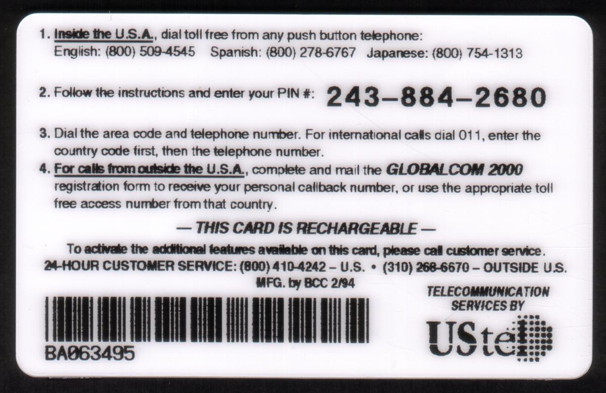 This card was manufactured in February 1994, as indicated by the provided manufacturing date. It is a user card linked with the Globalcom 2000 series and carries the designation of a Universal Telecom phone card meant for telecommunication usage.