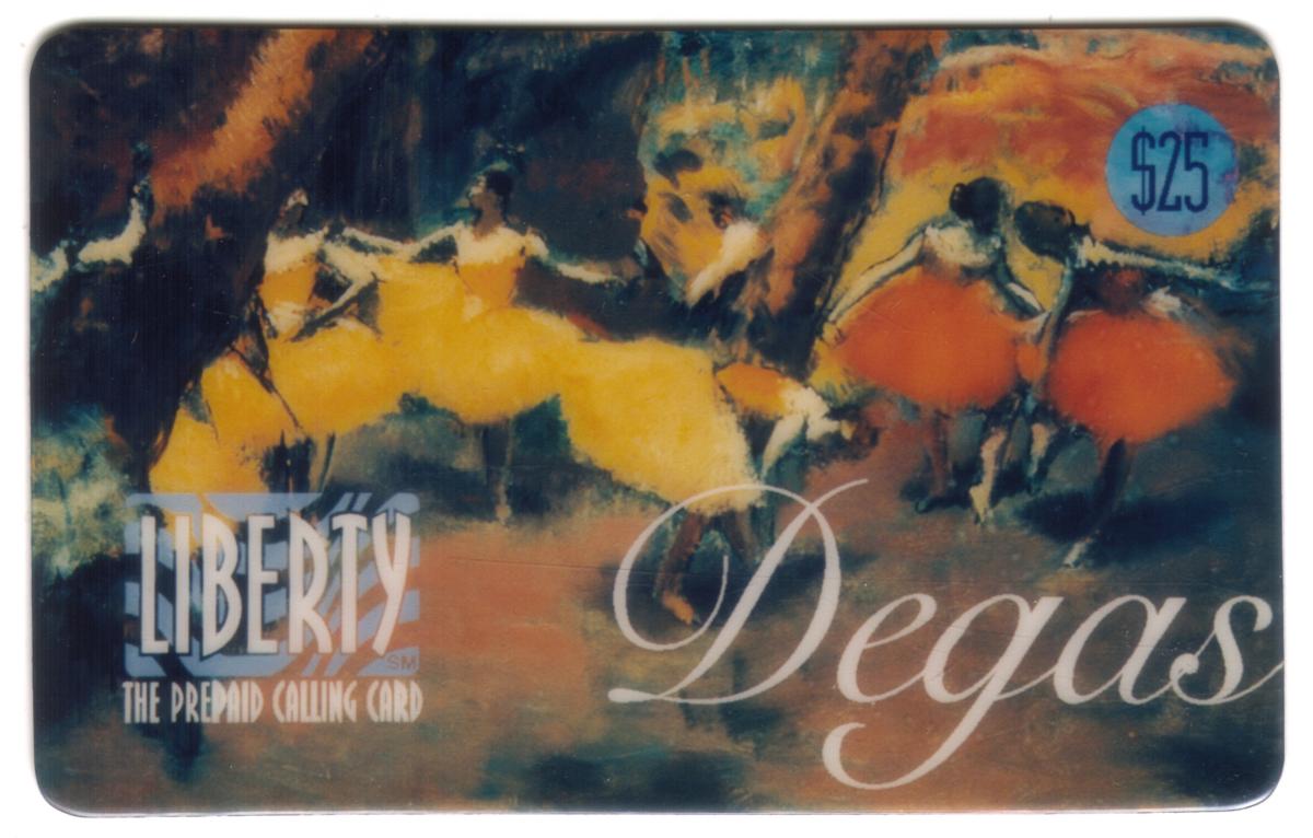 This card belongs to the Degas (Painting of Dancers) Series 'B', emphasizing fine arts and impressionism. It is identified as a premium collectible phone card issued by Quest Group International under the Liberty brand. The imagery and typography celebrate renowned impressionist artist Edgar Degas and his celebrated depictions of ballerinas, making this card a distinctive piece for collectors interested in art-themed phone cards.