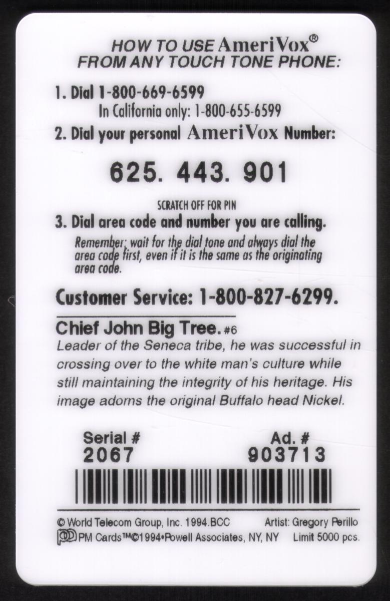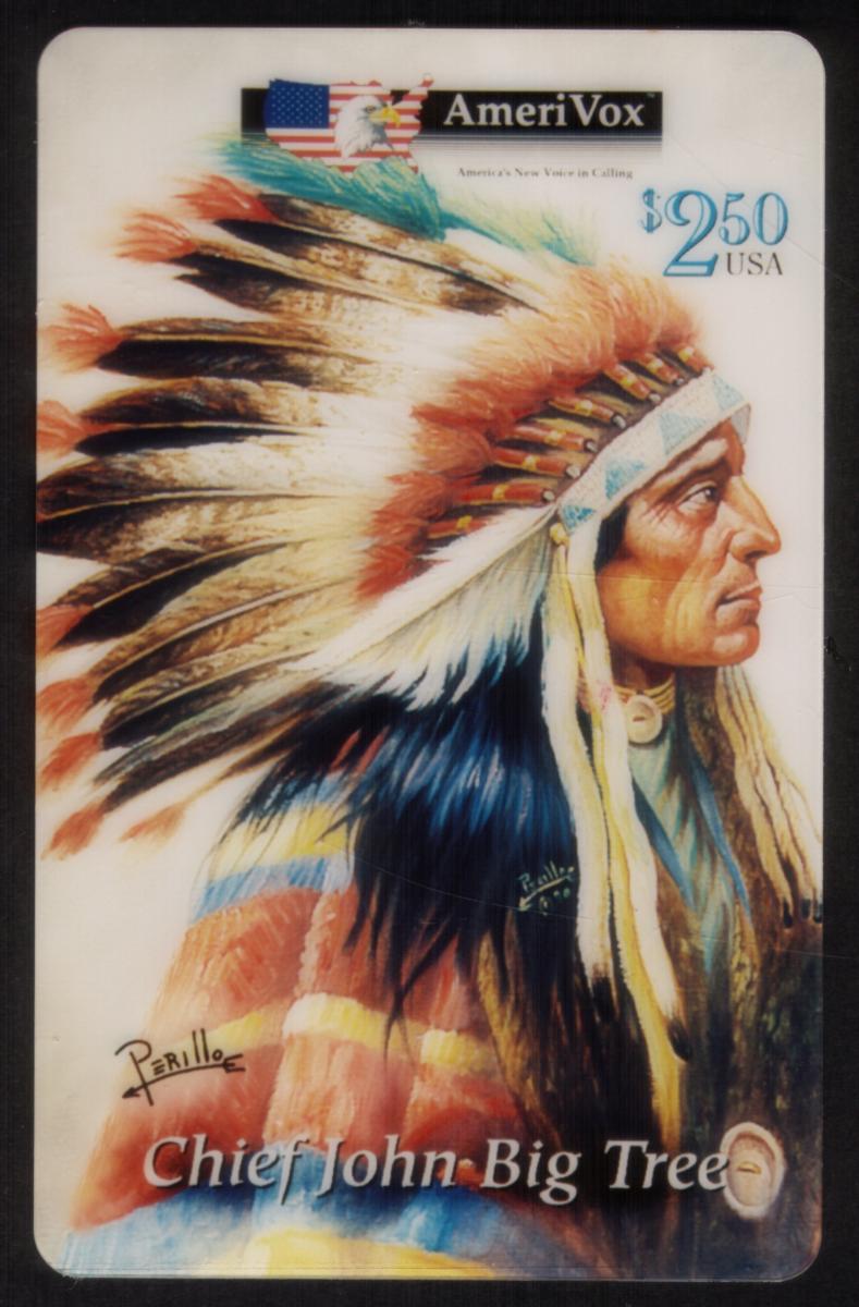 The card is issued by AmeriVox and includes a numerical value of $2.50 in the upper right corner, alongside the country designation “USA.” The AmeriVox logo is displayed beneath a small image of the American flag in the top center, accompanied by the text “America’s Voice From Coast to Coast.” The bottom edge of the card clearly states "Chief John Big Tree," identifying the subject directly.