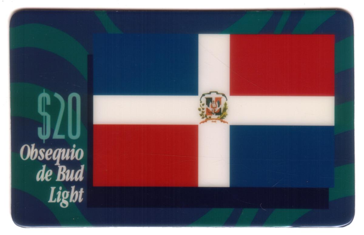 Dominican Republic flag with coat of arms, $20 denomination, Bud Light sponsorship, vibrant colors, green background, used as a prepaid calling card. |