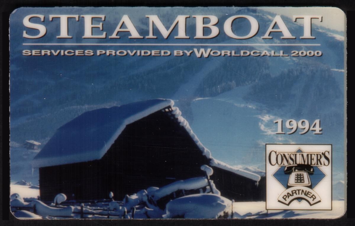 The top of the card prominently displays the word "STEAMBOAT" in large white capital letters. Below that, the text reads "SERVICES PROVIDED BY WORLDCALL 2000" in smaller white font. On the right side, the year "1994" is printed in white. Adjacent to the year is a logo that says "CONSUMER'S PARTNER" with an image of a telephone in the center, indicating the card’s association with phone services.