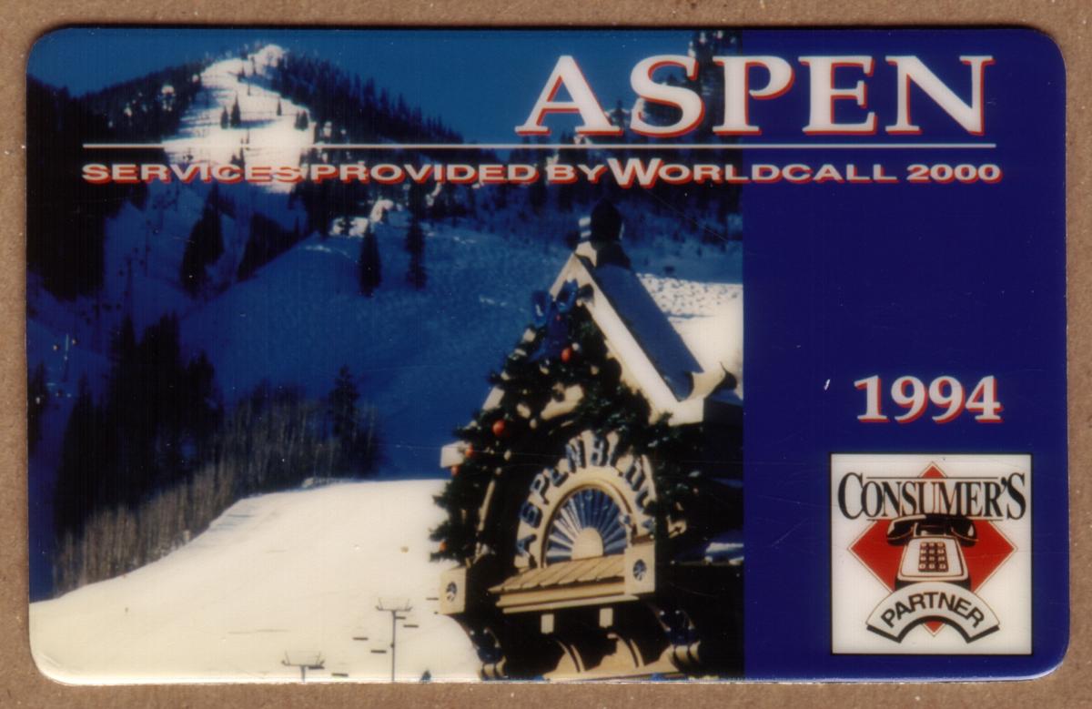 This collectible phone card features the Aspen Colorado Ski Resort, highlighting activities related to snow skiing and mountain sports. It prominently displays the year 1994 and references the Consumer’s Partner - WorldCall 2000, indicating a connection to telephone services or telecommunications from that era. The imagery and text indicate a strong association with winter sports in the mountainous region of Aspen, Colorado.