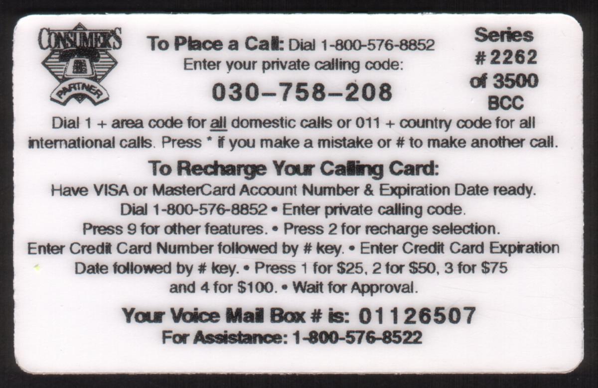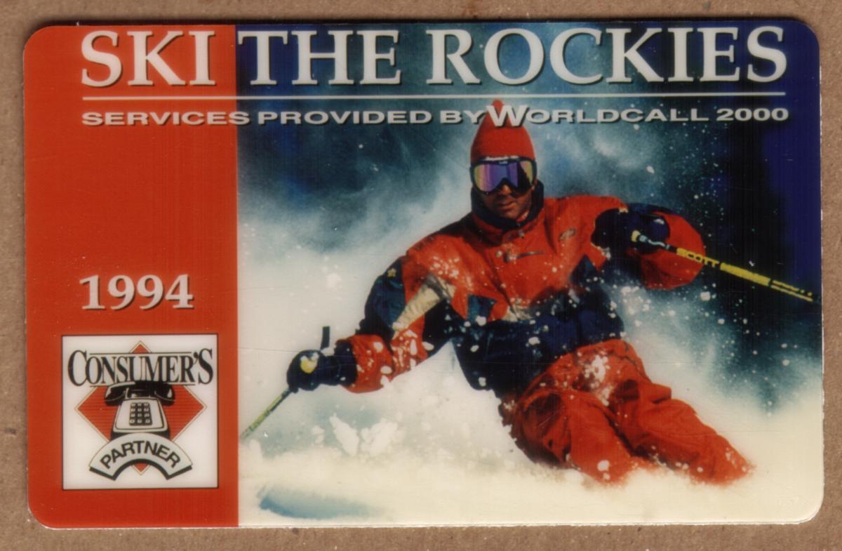This phone card clearly promotes skiing activities in the Rocky Mountains, offered by WorldCall 2000, and celebrates the sport with strong, vivid imagery and distinct branding elements related to Consumers Partner and WorldCall.