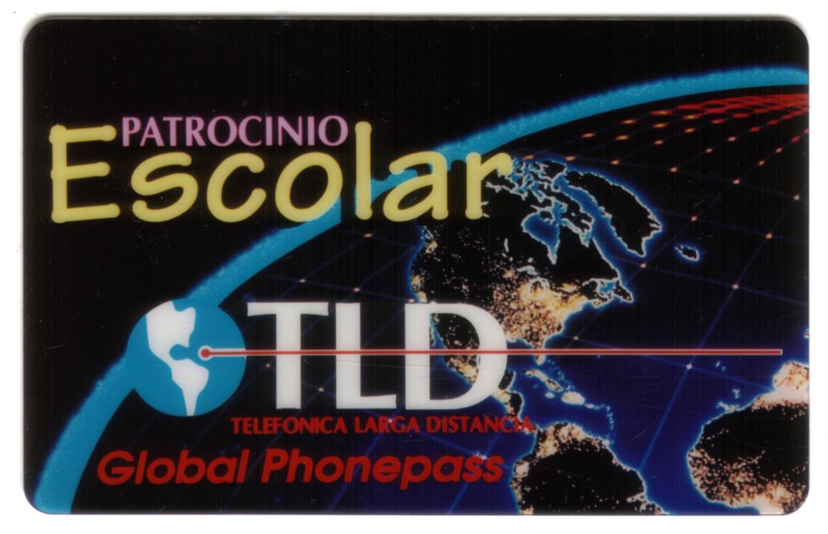 The card displays the text "Patrocinio Escolar" in yellow and purple fonts at the top left, emphasizing an educational sponsorship theme. Below this, large white letters reading "TLD" are accompanied by a red line and the words "Telefonica Larga Distancia" in smaller red letters directly underneath. Near the bottom, the phrase "Global Phonepass" is printed in bold red.