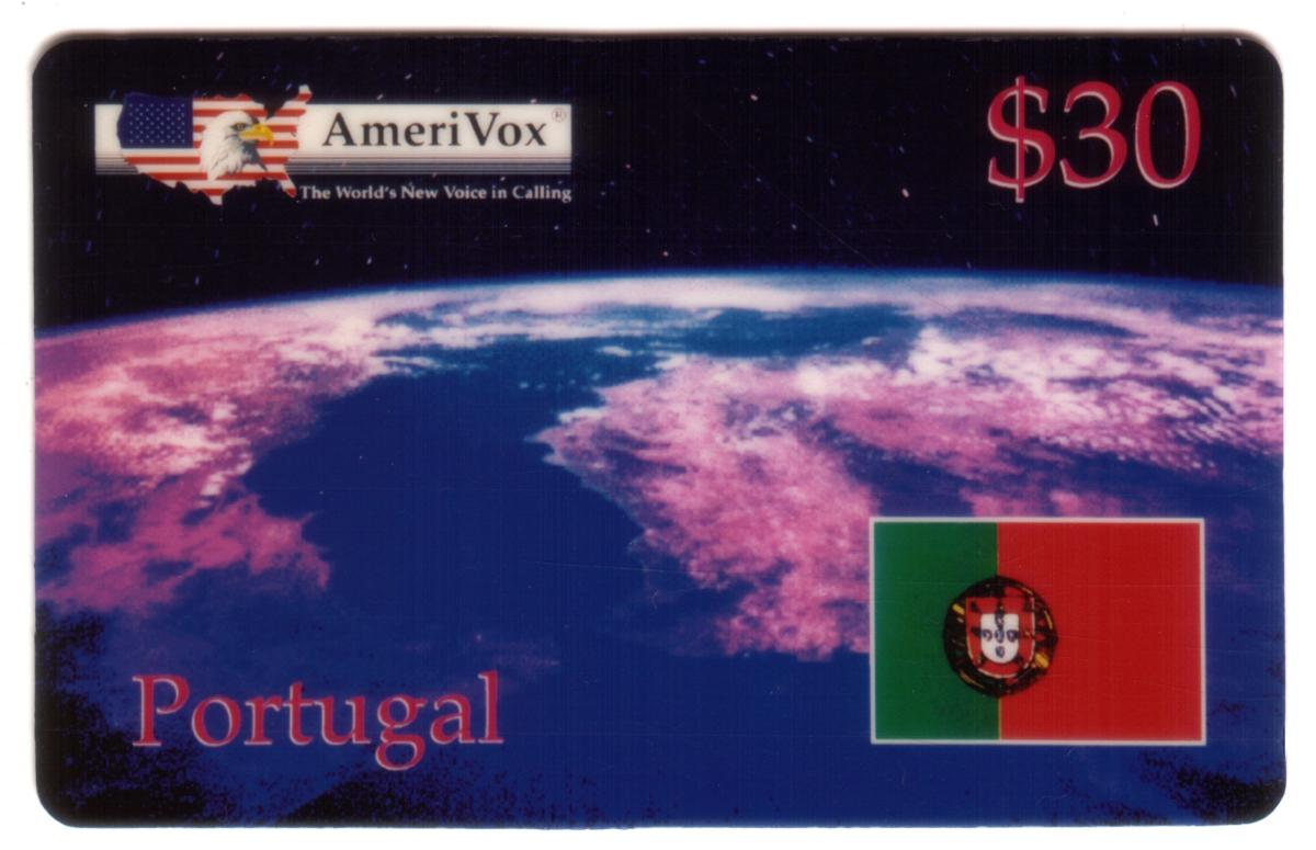 In the upper left corner is the AmeriVox logo, which consists of an American flag with an eagle and the text "AmeriVox" accompanied by the slogan "The World's New Voice in Calling." The denomination value "$30" is printed in red in the upper right corner.