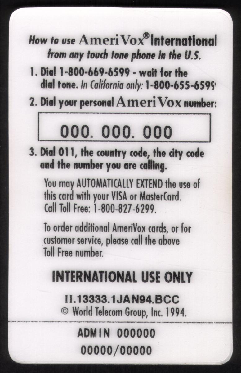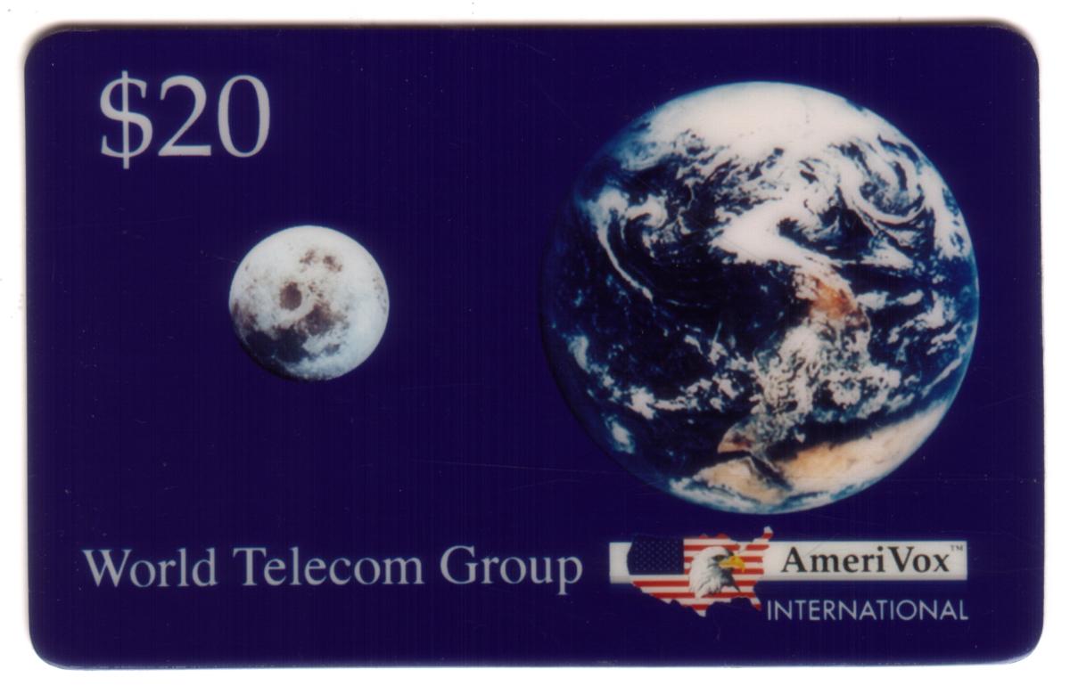 This card is associated with themes of space, globes, world, moon, American flag, eagles, space exploration, NASA, outer space, and satellite photographs. The presence of the World Telecom Group and AmeriVox suggest an international telecommunications connection.