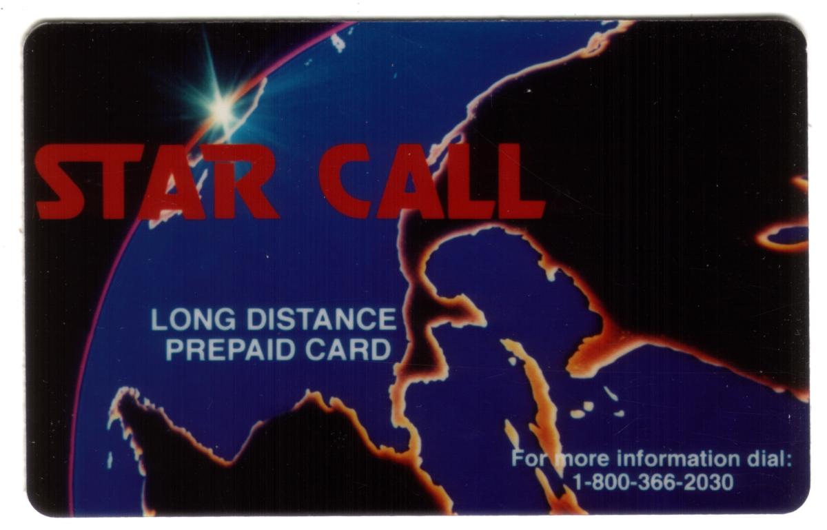 The top of the card is marked with the bold red text "STAR CALL," while beneath it, in white letters, is the description "LONG DISTANCE PREPAID CARD." At the bottom right corner, contact information is provided for customer service or inquiries, displaying the phone number 1-800-366-2030 in white text.