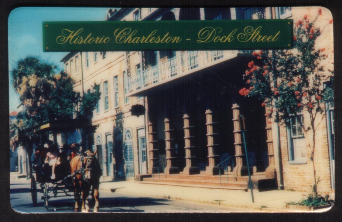 This collectible phone card features a historic scene from Charleston, South Carolina, specifically showcasing Dock Street. The image captures a horse-drawn carriage traveling along a sunlit street lined with historic buildings showcasing classic architecture. The buildings have multiple stories with elegant windows and cast shadows onto the pavement, reflecting the charm of this historic district.
