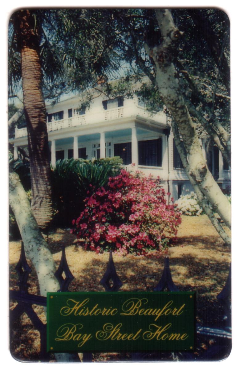 This collectible card features a colorful and detailed photographic image of a historic home on Bay Street in Beaufort, South Carolina. The foreground highlights pink flowers adding a vibrant touch to the scene. The house itself presents classic architectural details reflective of historic American homes, with a porch, steps, and white columns visible. The image captures clear daylight, emphasizing the well-maintained façade and surrounding greenery.