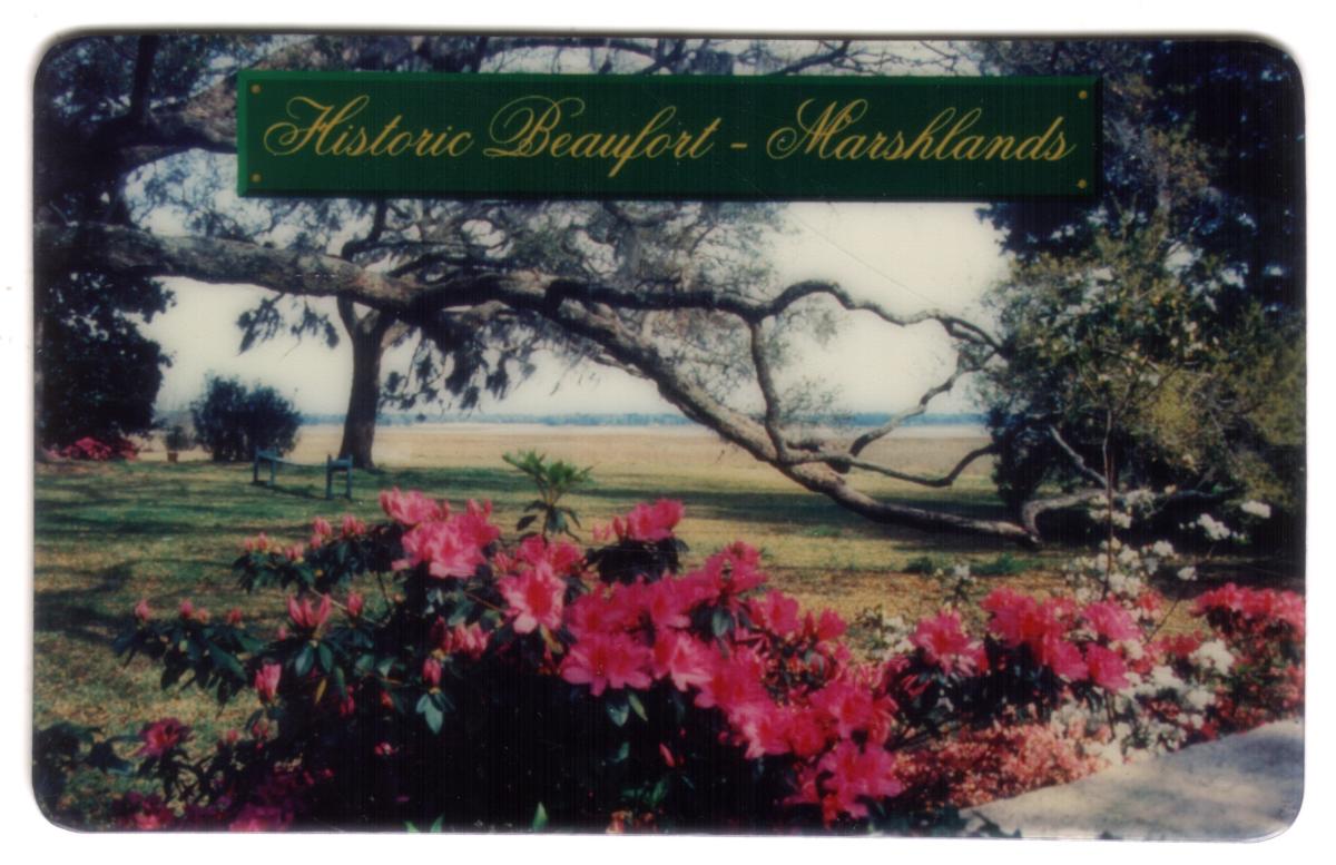 This collectible phone card features a detailed photographic image of the historic town of Beaufort, South Carolina. The image highlights the marshlands that surround the area, showing a lush landscape with tall grasses and water channels typical of South Carolina’s coastal environment. The scene captures the serene natural beauty of the marshes, with green vegetation dominating the foreground and extending into the distance, illustrating the connection between the town and its natural surroundings.