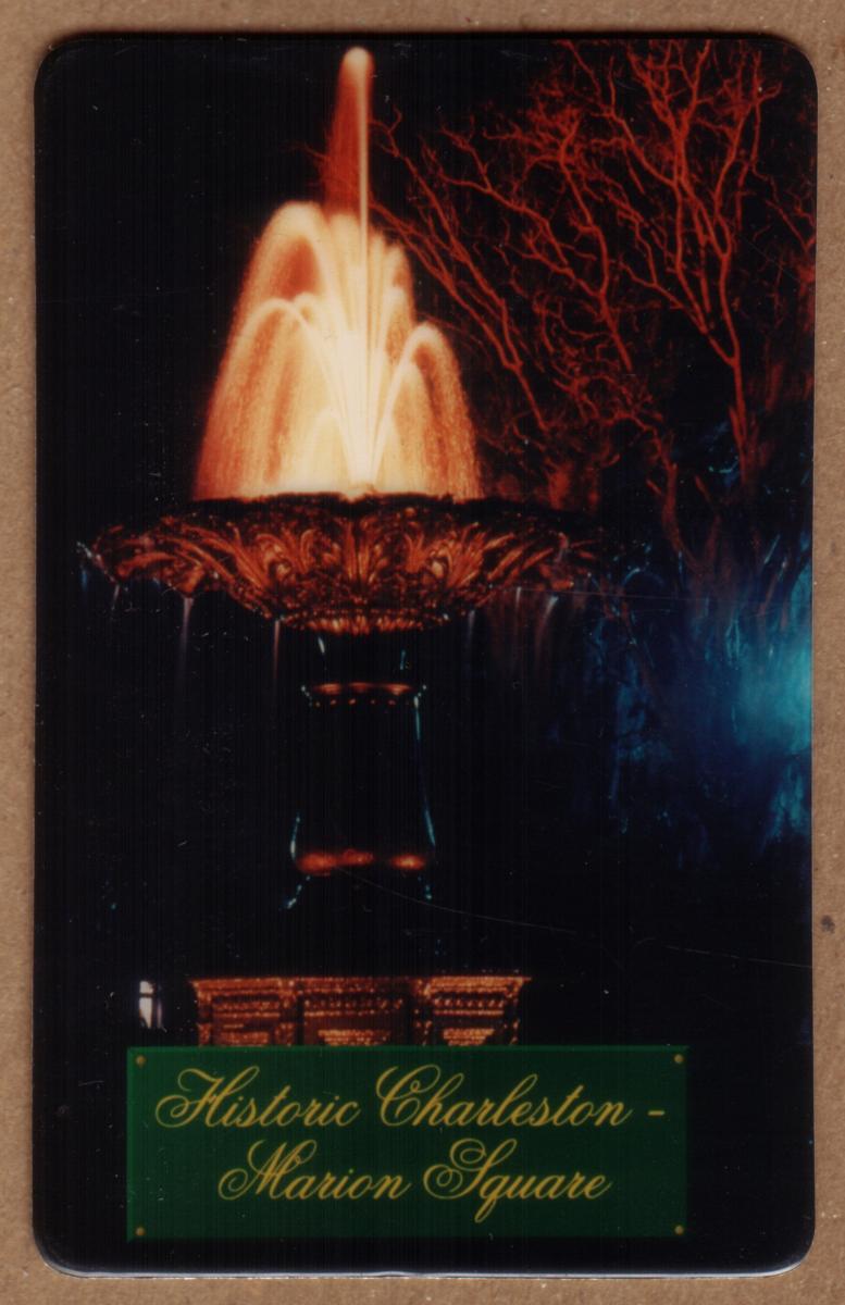 This collectible card features a photograph of the Marion Square Fountain located in Charleston, South Carolina. The image presents the fountain prominently in the center against a clear daylight sky. Surrounding the fountain are trees and some urban elements, capturing a scenic view of this historic public space. The text on the card identifies the location clearly as “Historic Charleston, South Carolina,” and specifically highlights Marion Square Fountain.