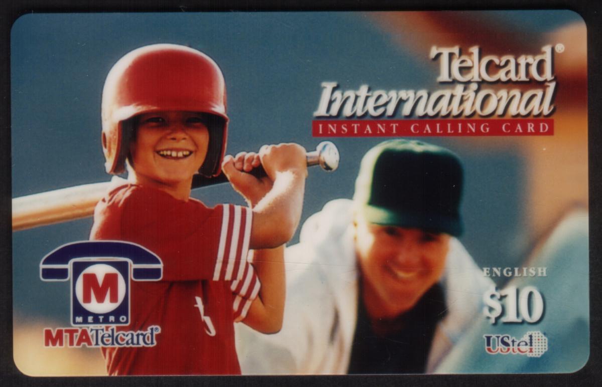 This collectible phone card is a USTel Telecard International Instant Calling Card with a $10 value, issued under the Metro MTA Telcard program. It prominently features the image of a young boy holding a baseball bat, wearing a red batting helmet and a red baseball jersey with white stripes on the sleeves. The boy is smiling directly at the viewer. In the background, slightly blurred, there is an adult male figure in white attire and a dark baseball cap, also smiling.