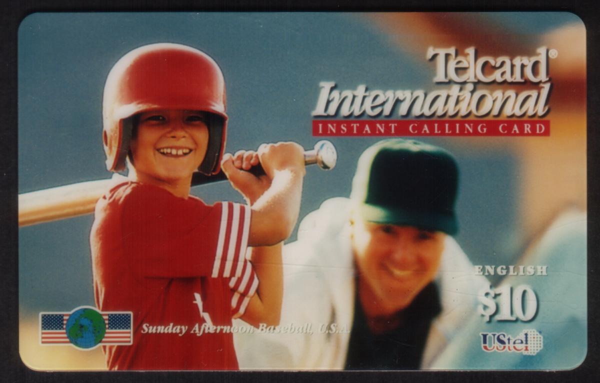 This card captures an American baseball theme, emphasizing a sunny, recreational Sunday afternoon. It was issued by UStel and branded under Telcard International for international instant calling services with a $10 value. The overall design reflects a cheerful and sporty atmosphere.