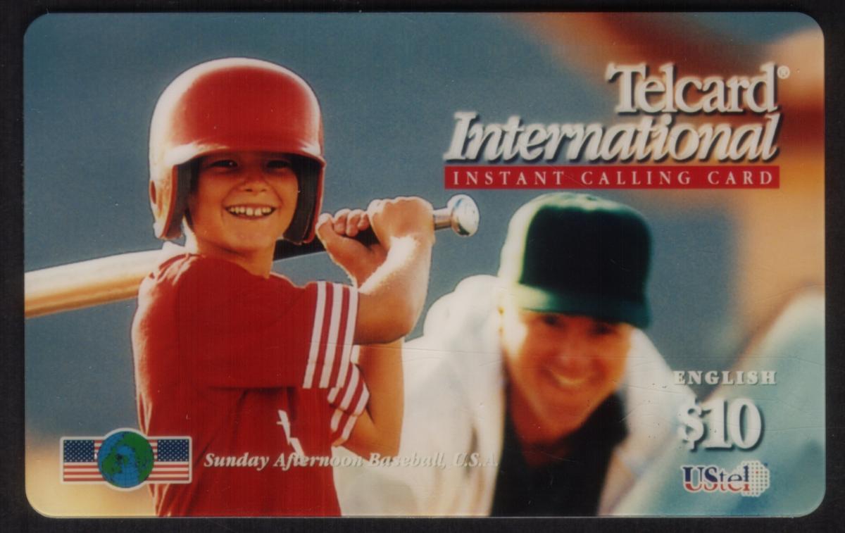This card’s artwork captures a cheerful and nostalgic baseball moment, combining an American sports theme with global calling convenience through USTel. It includes the keywords "sports: baseball lefty," "Sunday Afternoon Baseball USA," "American flags," "globe," "Boy with Baseball Bat," and "Globalcom 2000 USTel," reflecting its collectible and thematic significance.