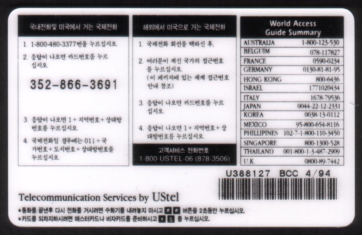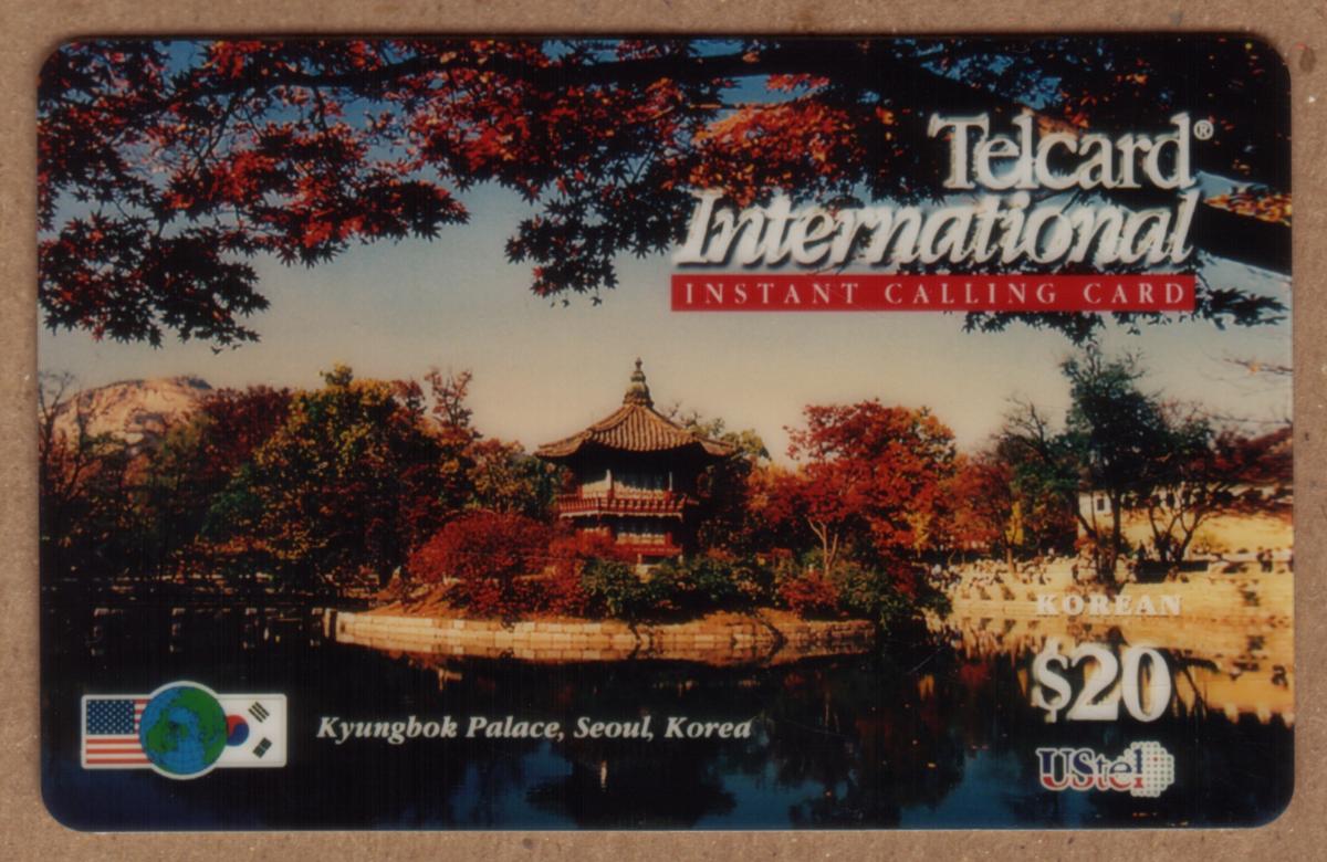 Keywords: user card, us tel, ustel, telecard international instant calling card, american flag, korean flag, globe, travel, scenic. korean reverse, Globalcom 2000 USTel