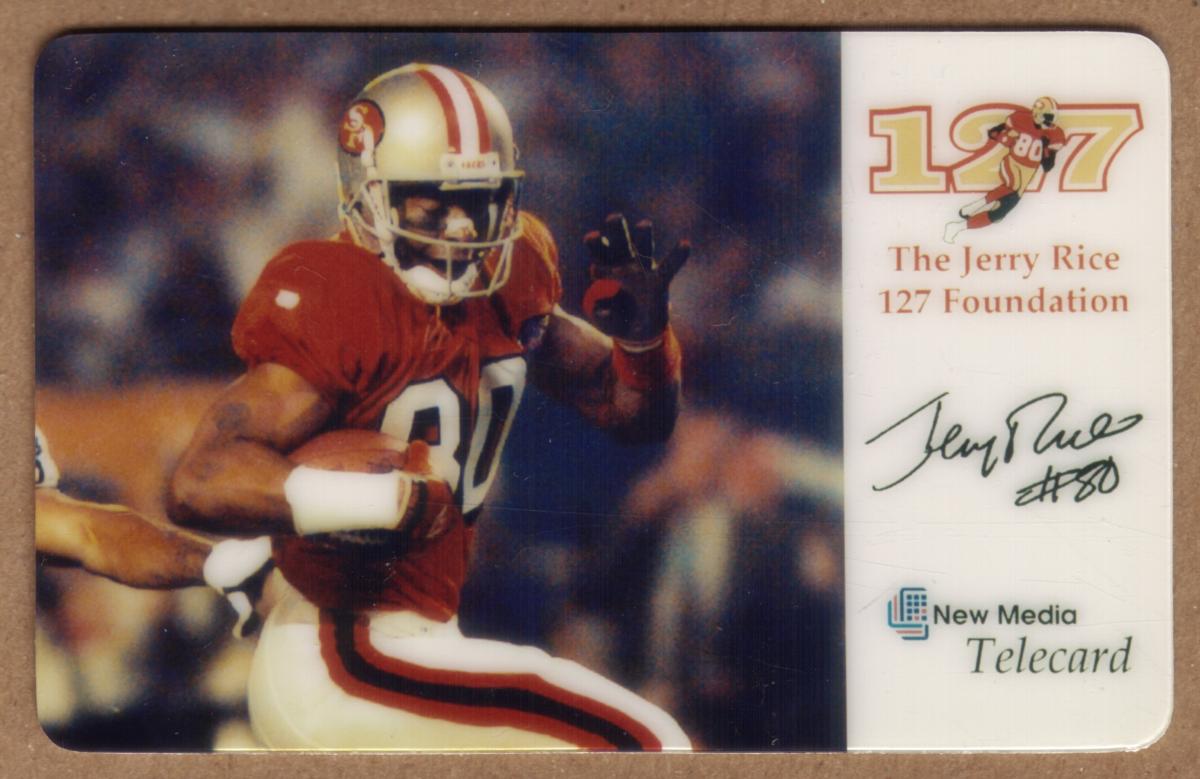 On the right side of the card, the logo “127” is displayed in gold and red with a small illustration of Jerry Rice running, linking the design to The Jerry Rice 127 Foundation, a non-profit charity focused on sports management and community support. Below the logo is the printed signature "Jerry Rice #80," emphasizing the connection to the player. The card also carries the New Media Telecom NMTI branding with the text “New Media Telecard” indicating the card’s telecom collectible status.