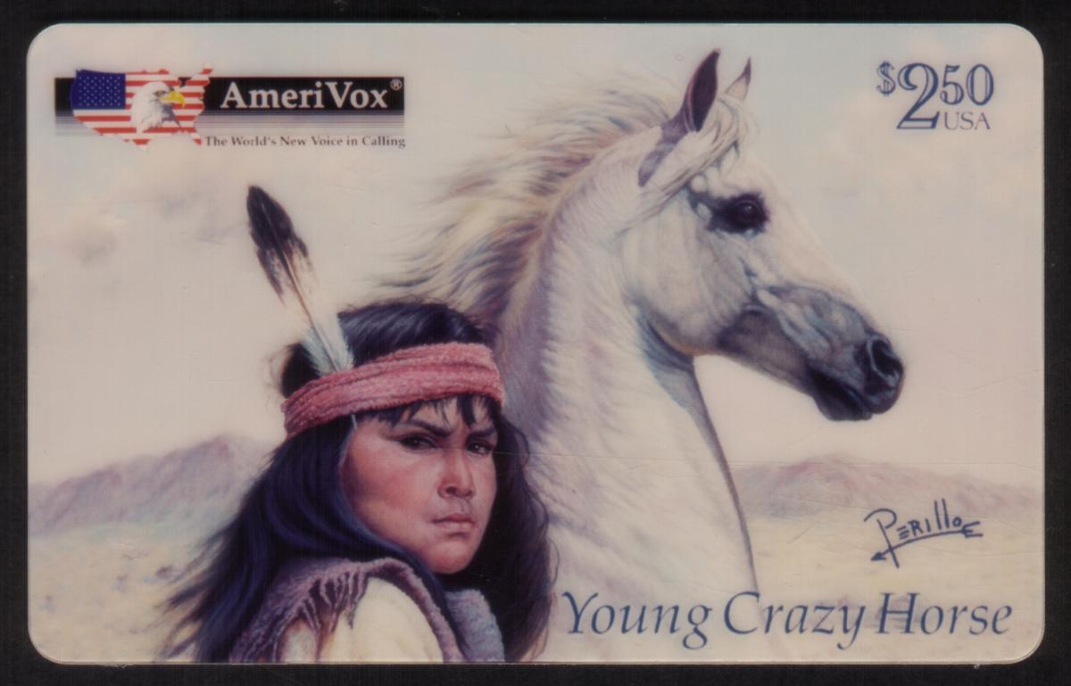 The card represents Americana and Native American culture through skilled artistic work, making it a collectible item valued by those interested in American history and indigenous heritage. It combines themes of war, animals, and cultural pride, showcasing Young Crazy Horse as a significant figure in this portrayal.