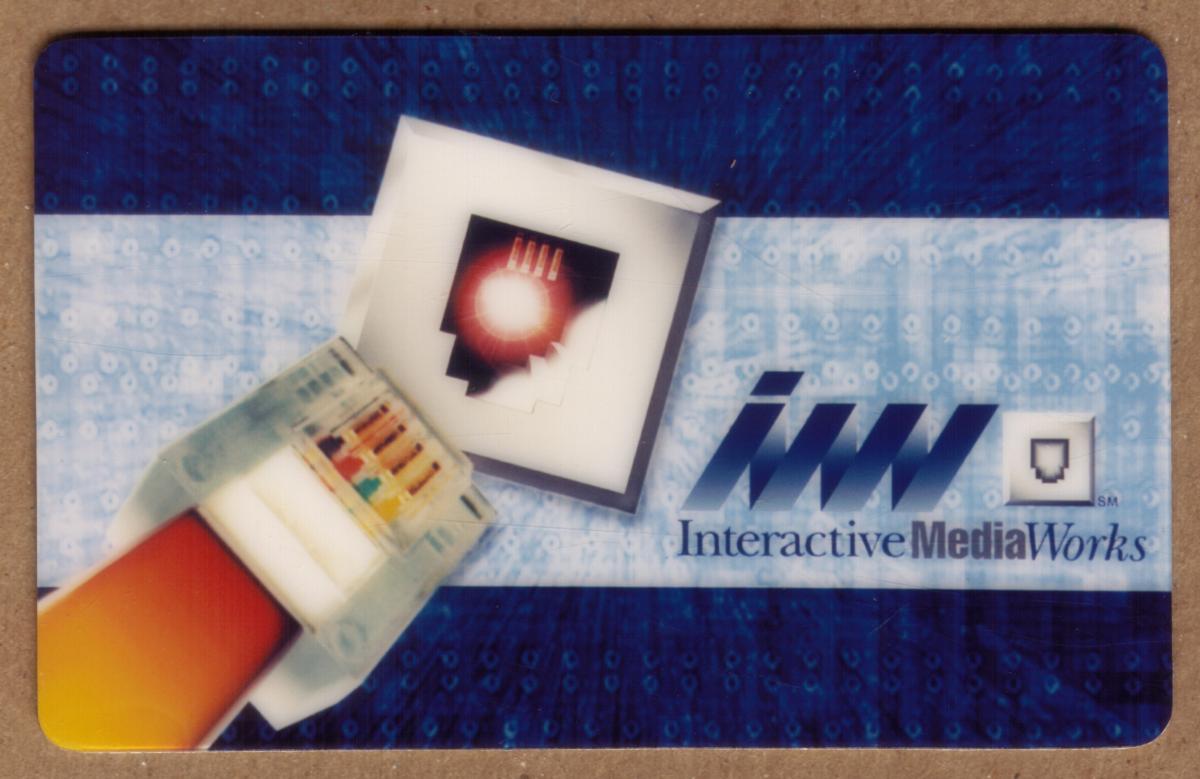 This collectible card features a graphic design related to Interactive Media Works (IMW). The background is predominantly dark blue with a pattern resembling binary code, symbolizing digital technology. Across the center is a horizontal light blue band that contains the IMW logo and brand name "Interactive Media Works." The logo consists of stylized letters "imw" in black and blue with a distinctive graphic element showing a computer network connector plug emitting three white rays of light within a white square tilted slightly to the right.