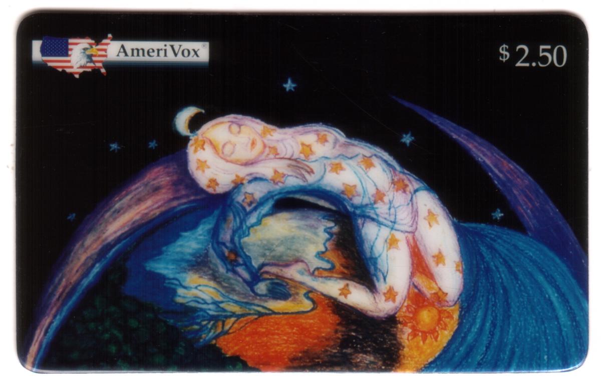 This collectible phone card from AmeriVox features an artistic and spiritual painting titled "Lady of the Stars" by Annette Kraemer. The artwork depicts a serene female figure draped in a celestial-themed garment adorned with orange stars. She is positioned in a graceful arch over Earth, symbolically embracing the planet beneath a crescent moon and surrounded by a dark night sky dotted with stars. The painting vividly conveys a sense of cosmic connection and religious reverence.