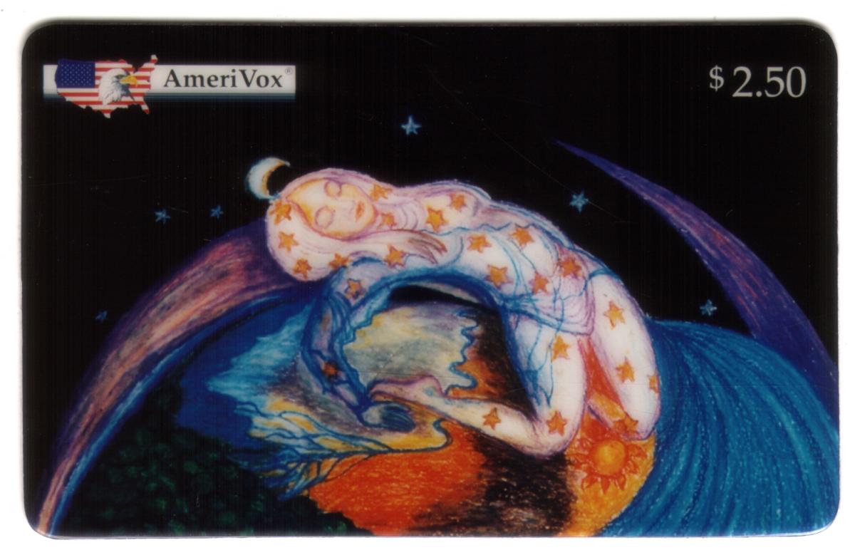 The card displays the AmeriVox logo in the top left corner, accompanied by a stylized American flag design. The denomination of $2.50 is printed in the top right corner in clear white text. The colors throughout the card are rich and vibrant, featuring deep blues, purples, oranges, and subtle pastels that enhance the dreamlike quality of the artwork.