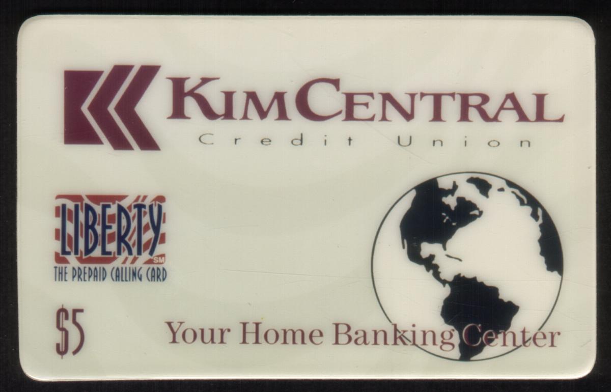 Prepaid calling card featuring KimCentral Credit Union branding, patriotic Liberty logo, globe motif, and $5 value, emphasizing global connectivity and trust. |
