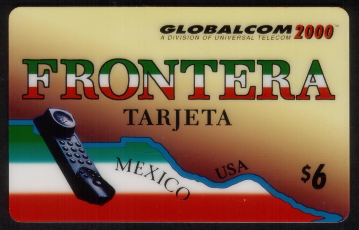 A black telephone handset, angled diagonally, is placed on the left side of the card, symbolizing phone services. The denomination "$6" is clearly printed on the right side of the card in black. The card relates to telephonic communication services between Mexico and the USA and includes Spanish-language text. Keywords associated with this card are Globalcom 2000, Universal Telecom, USTel, Frontera Tarjeta, Mexico Calling, and Spanish reverse.