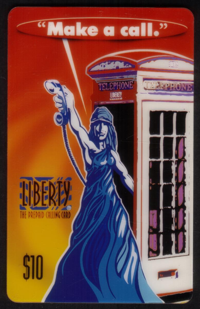 This card highlights themes of communication and accessibility through the blend of text and visual elements portraying the woman urging the user to "Make a call" using the Liberty telephone booth. The strong graphic lines and bold color choices create a memorable and collectible phone card image.