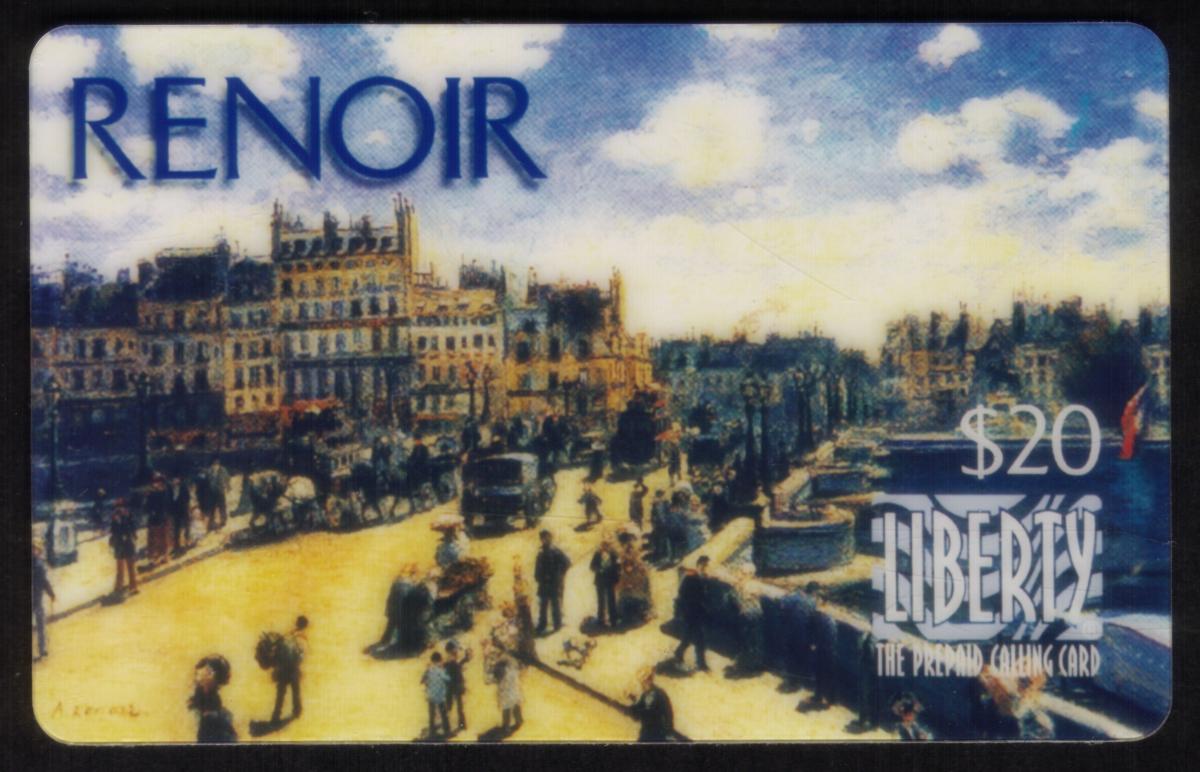 The card displays the text "RENOIR" prominently at the top left in capital letters. On the right side, it indicates a value of "$20" alongside the logo and text for LIBERTEL, identifying it as a prepaid calling card. The design incorporates bright colors and fine details characteristic of post-impressionist art, reflecting Renoir’s artistic style.