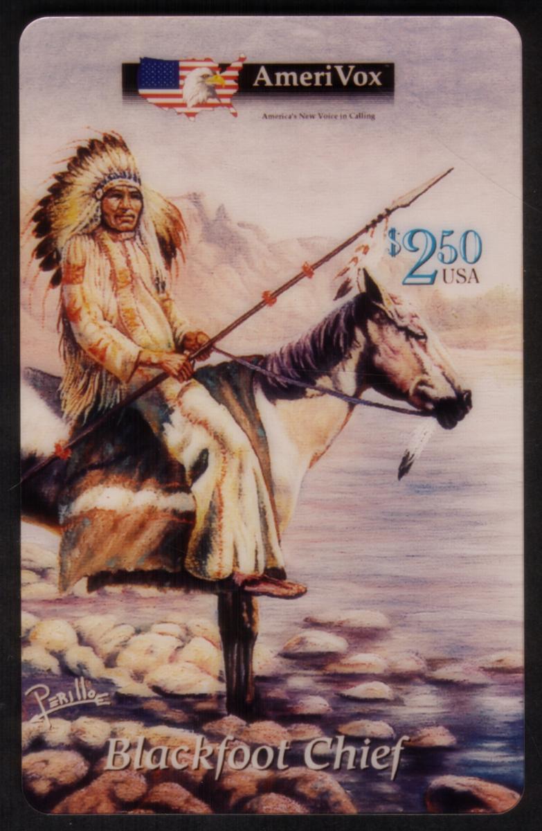 At the bottom of the card, the text "Blackfoot Chief" is printed, and the artist's signature, Perillo, is visible on the lower left corner. This card is marked as USED and is part of a collection celebrating American Indian culture and animals.