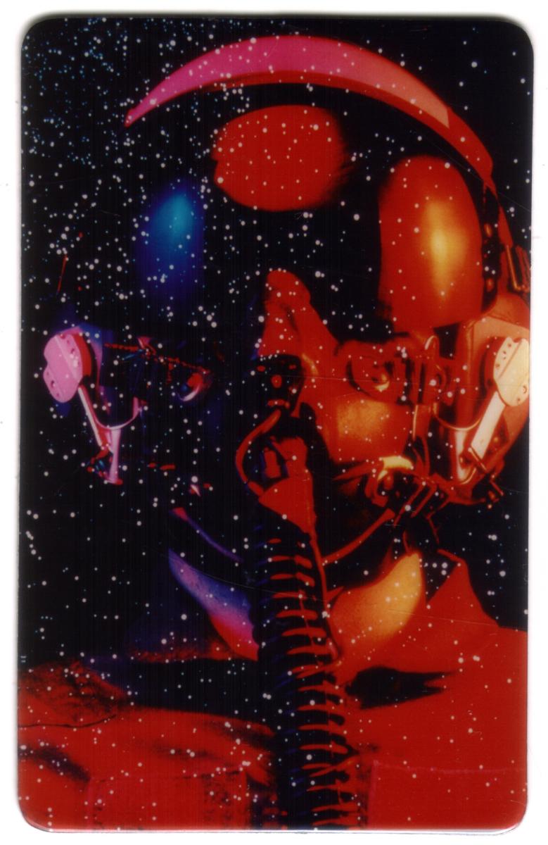 This collectible phone card features a striking image of a futuristic robot or android figure rendered in vibrant red and orange hues set against a dark star-speckled background that resembles outer space. The robot has a humanoid shape with a helmet-like head and mechanical arms and shoulders, detailed with tubing and jointed components. The design evokes a science fiction or space exploration theme, emphasizing advanced technology and artificial intelligence.