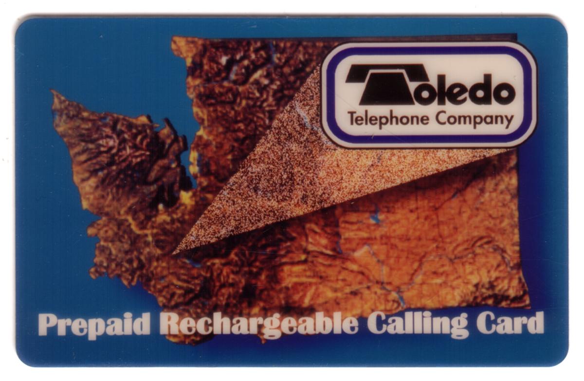 This collectible prepaid rechargeable calling card is issued by Toledo Telephone Company. The card features a design with a textured, rust-colored abstract shape against a solid blue background, presenting a distinctive and artistic visual element. The Toledo Telephone Company logo is prominently placed in a white-bordered rectangular frame near the upper right corner of the card.