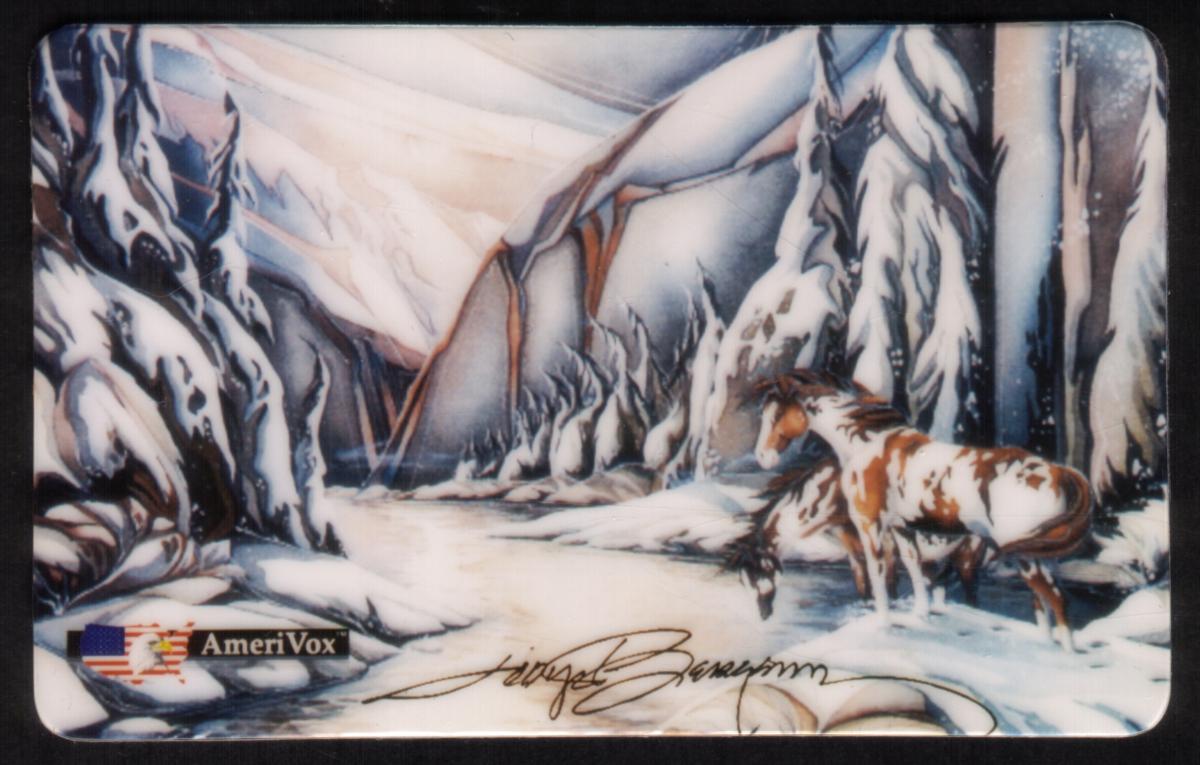 This collectible phone card features an artistic watercolor painting by Jody Bergsma, showcasing a serene winter mountain scene. The image depicts horses standing amid snow-covered trees and rugged mountain peaks, rendered in soft, flowing brushstrokes. The peaceful setting evokes a quiet strength, aligning with the card’s title "Strength In Silence" from the 1993 Signature Series.