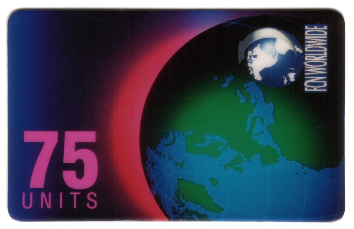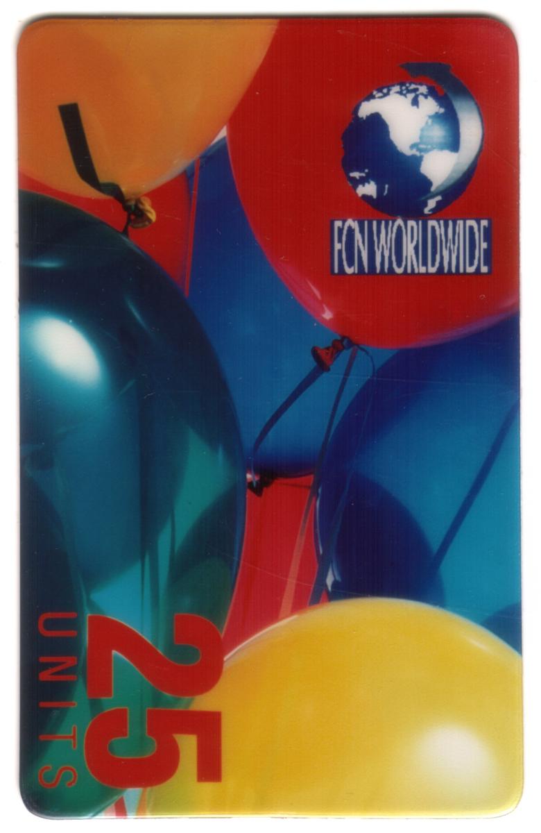 There are four distinct proof versions labeled "FCN Worldwide," each presenting unique graphical elements centered on global telecommunications. The set includes cards with different values: 5, 25, 50, and 75 units, all with blank reverses. The cards are prototypes identified as Globe, Maps, and Balloons, emphasizing world connectivity concepts through vivid and colorful artwork.